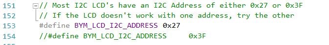 Set BYM_LCD_I2C_ADDRESS to the address of the LCD. For most I2C character LCD’s this is either 0x27 or 0x3F.