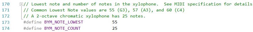 Set the lowest note and number of notes for the xylophone. Notes are specified as the MIDI note number. For example, a G-to-G 2-octave chromatic xylophone would have BYM_NOTE_LOWEST = 55 and BYM_NOTE_COUNT = 25.